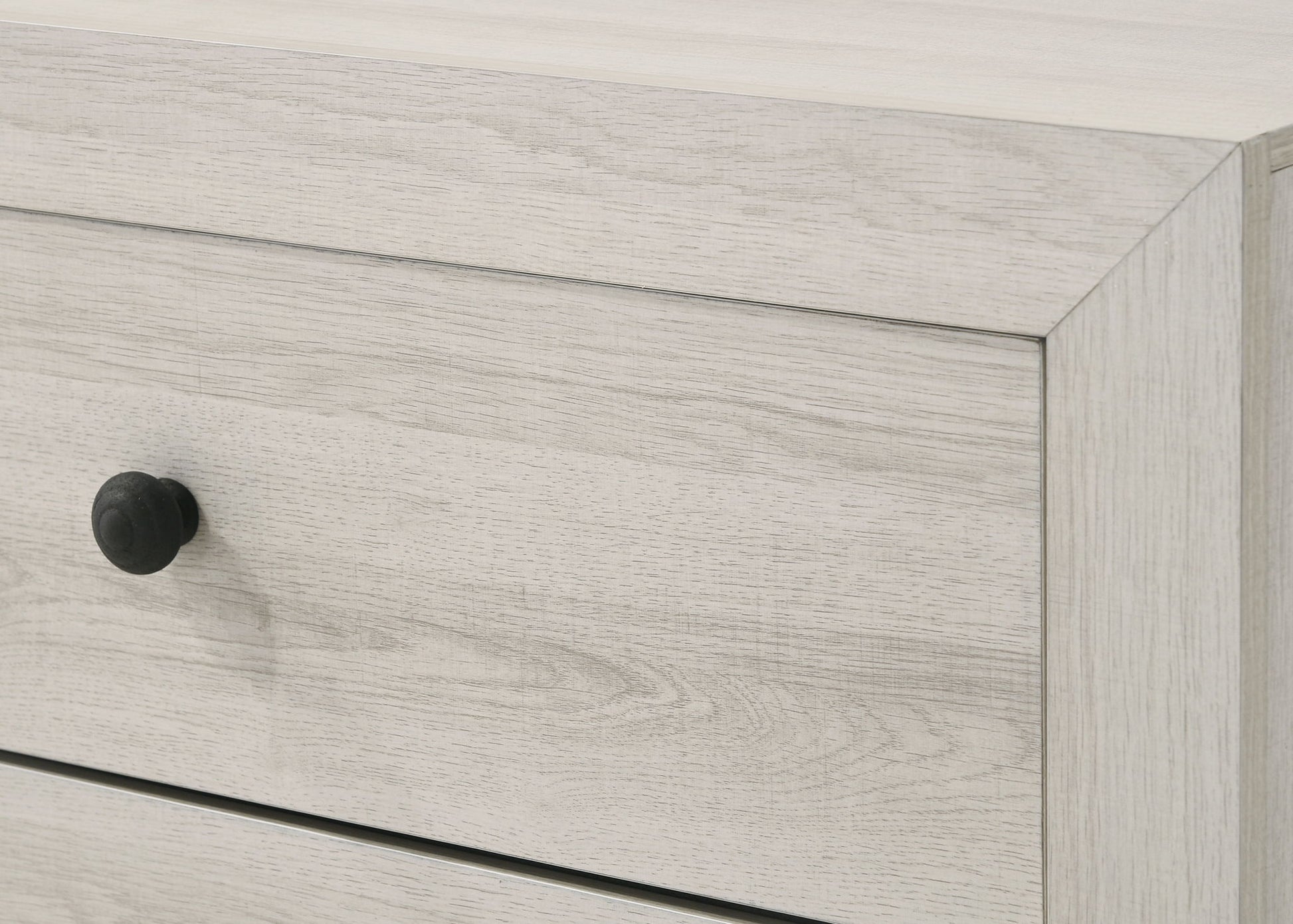 This bedroom collection embodies a rustic, yet minimalist aesthetic with its clean lines and neutral color palette. The set includes a low-profile bed frame, a dresser with a mirror, and a tall chest, all finished in a versatile that easily complements any decor. The sleek metal handles on the drawers add a touch of contemporary flair, while the large mirror reflects light, making the space feel brighter and more open.