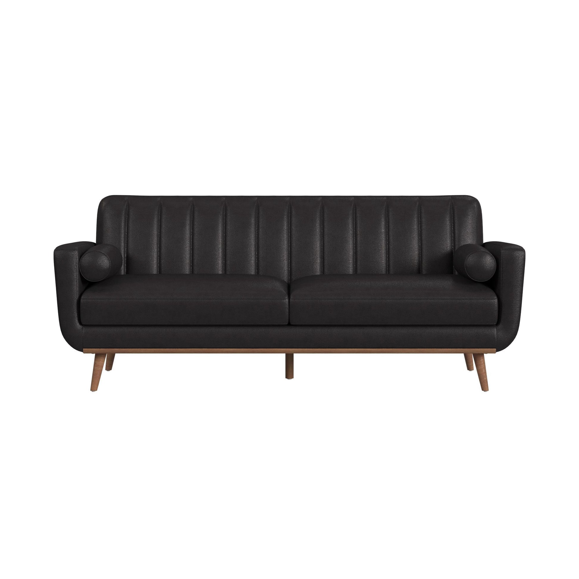 The Horizon Sofa with Wood Front and 2 Six Inch Bolster Pillows exudes the coveted charm of mid-century modern style. Built with a frame fully upholstered in quality faux leather, this piece is built for durability. Comfortable foam cushioning, decorative tufting on the backrest, and track arms forming sleek and modern lines culminate to mark thoughtful design, while an exposed front rail and wood legs highlight excellent craftsmanship. For a refined and sleek addition to your living space, the Horizon Sofa with Wood Front delivers in quality and style.