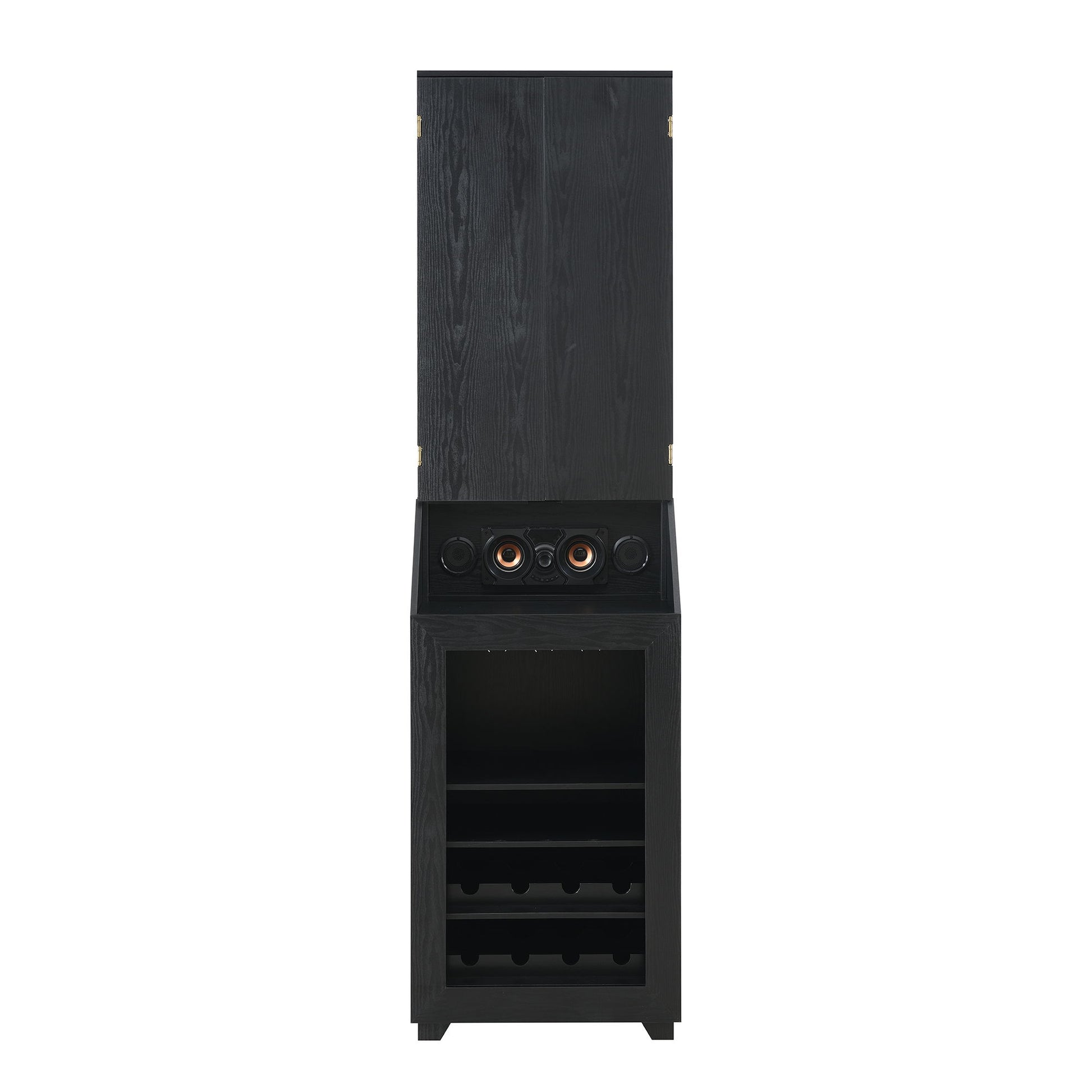 The Hurricanes Dartboard Cabinet is a multi-functional accent for your game room. Built with a high-quality oak veneer in a grained, black finish, this piece is as durable as it is sleek. The cabinet doors open to reveal two scoreboards and an LED-lit dartboard, creating the perfect setting to play a classic pastime. Above the spacious open shelves and wine racks are Bluetooth speakers that further enhance your game room experience. For a versatile and practical addition to your home’s gaming area, the Hurricanes Dartboard Cabinet delivers.