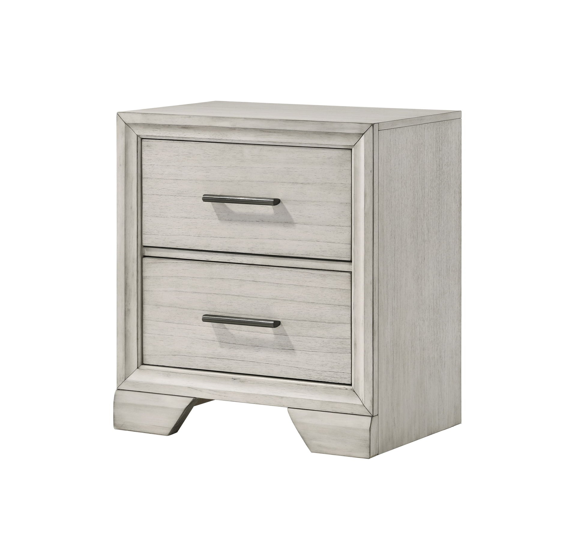 This bedroom set offers a sleek and stylish update to any space, featuring a white mist finish that commands attention while maintaining a sense of warmth and coziness. The bed stands as the stunning centerpiece, with its high, padded headboard upholstered in a plush fabric that invites relaxation and comfort. Flanking the bed are matching nightstands, providing convenient access to storage and display space. The set is rounded out with a capacious dresser, accented with a broad mirror that adds depth and brightness to the room.