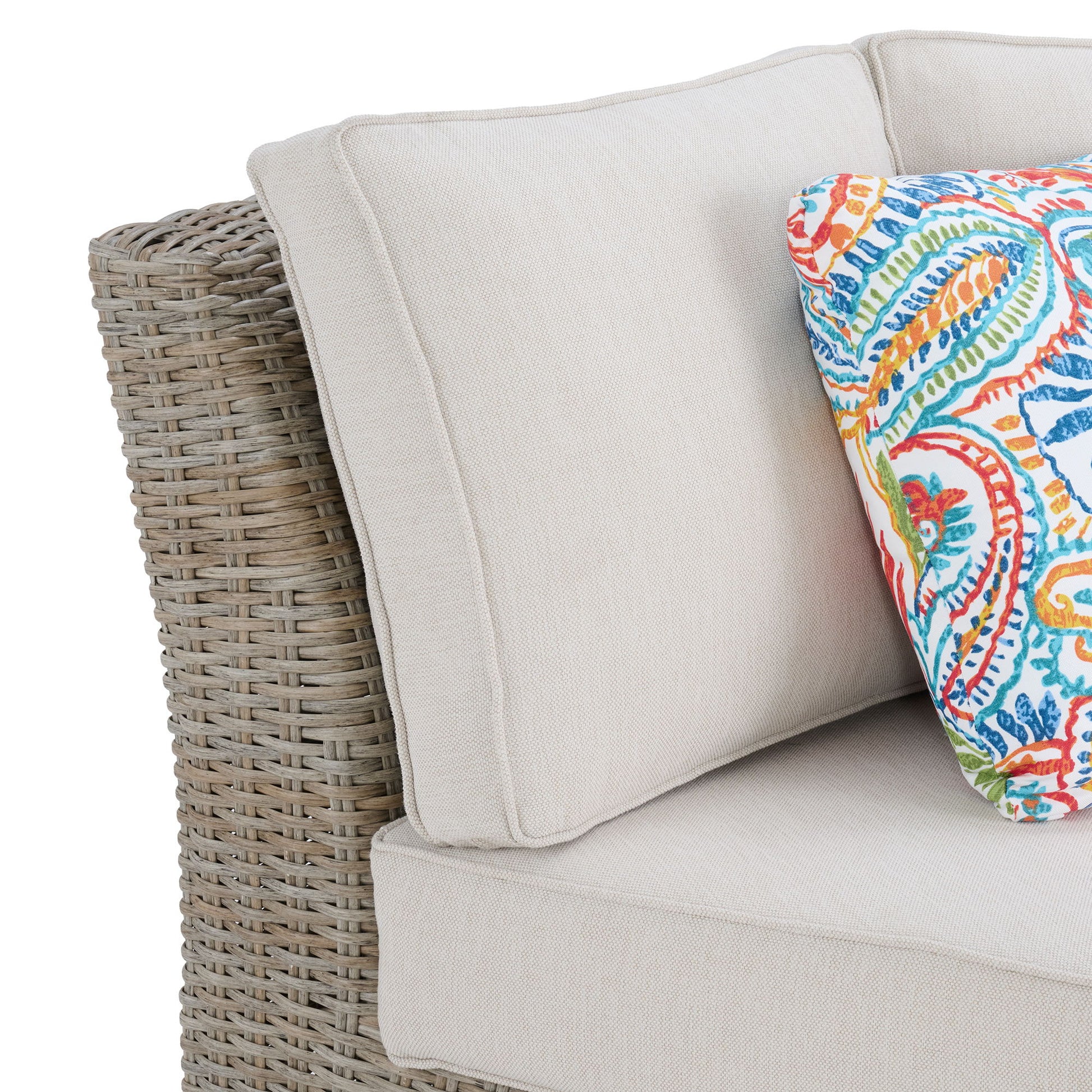 The Ollie Curved Loveseat patio furniture piece just made your backyard experience a little more inviting. Crafted with a powder coated frame, this outdoor seat promises countless years of cherished memories with its unique half round weave design. You'll find upholstered cushions with additional accent pillows for you to sit back, relax, and gather around for some fresh outdoor air. Pair two of these together, and let the Ollie Curved Loveseat make your patio the new favorite hangout spot.