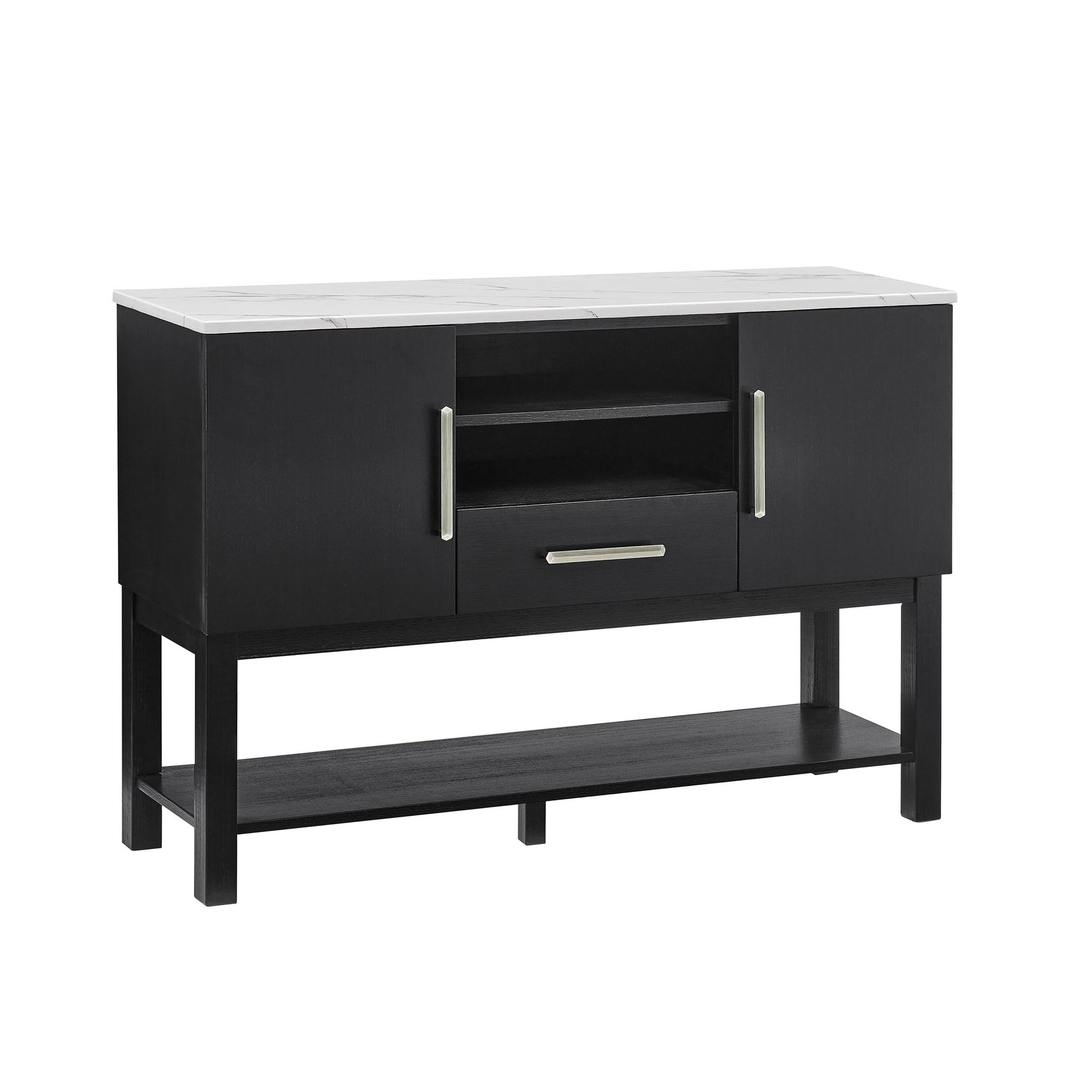 This sleek and modern storage solution is designed to elevate your living space with a perfect blend of functionality and style. Its elegant dark finish exudes sophistication, while the spacious interior offers a variety of storage options, including multiple open shelves, a central drawer, and cabinets with easy-access doors. Ideal for organizing and displaying your essentials, the sturdy structure promises durability and convenience, making it a versatile addition to any room. The contrasting light top surface adds a touch of contemporary flair, ensuring this piece seamlessly integrates with your decor while providing practical storage solutions for your home.