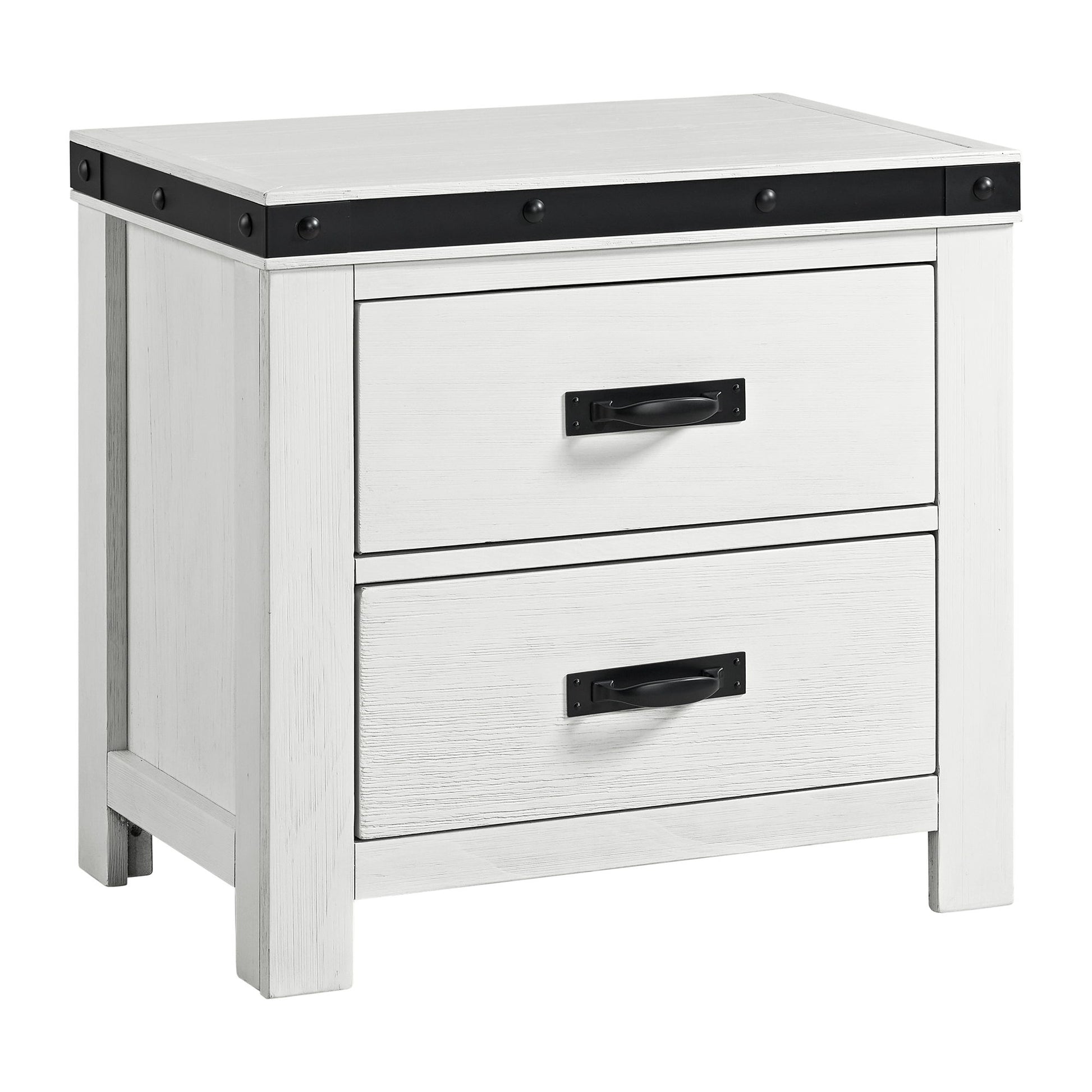 The Wade Youth Nightstand in White brings a modern touch to any room with its sleek black accents and contemporary design. Crafted with stylish black rivet detailing on the black metal trim, it exudes an industrial edge. Featuring spacious drawers with smooth ball bearing glides, this nightstand offers ample storage for clothes and accessories. A dust-proof layer on the bottom drawer ensures your belongings stay clean, while the top drawers are lined with black felt to protect delicate items. Compact in design, it's perfect for smaller bedrooms, combining functionality and modern style in one stunning piece.