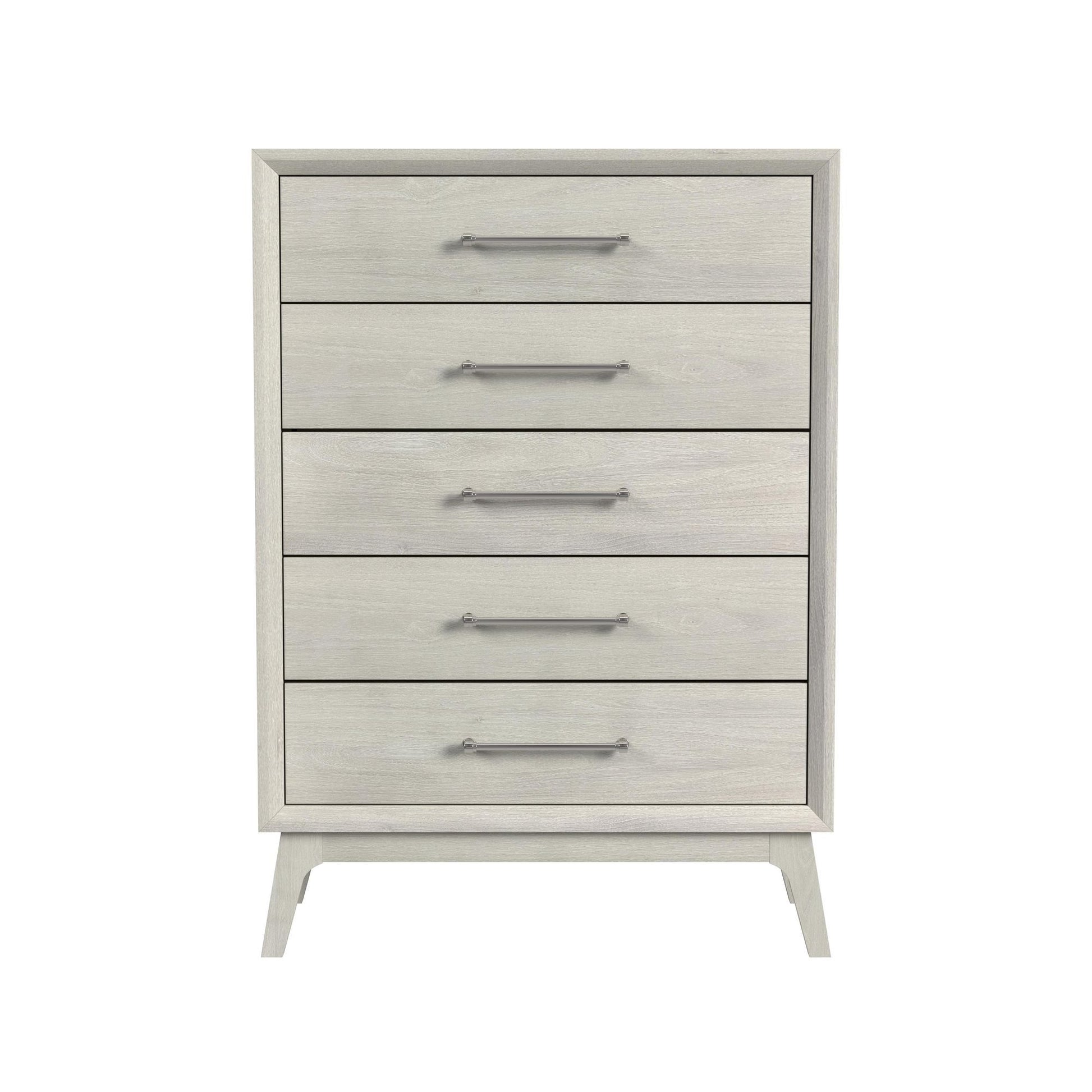 Give your bedroom a fresh, modern vibe with the contemporary Westland 5-Drawer Chest. The almond-colored wood adds a cozy, natural touch to your space. It features sturdy butt joint construction with corner blocked reinforcements, while the top drawer lined with black felt gives this case piece a classy feel. Included is an anti-tipping kit for extra safety that is easy to install. Upgrade your bedroom with this chic and practical chest designed to make your everyday life stylish and organized.